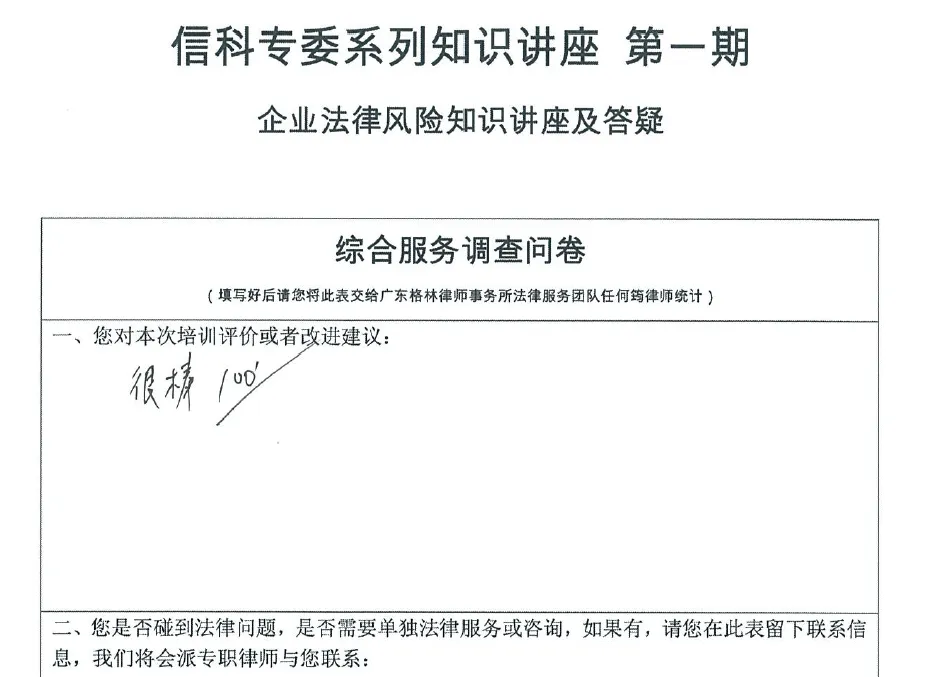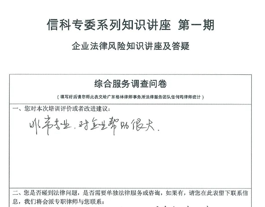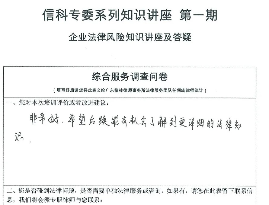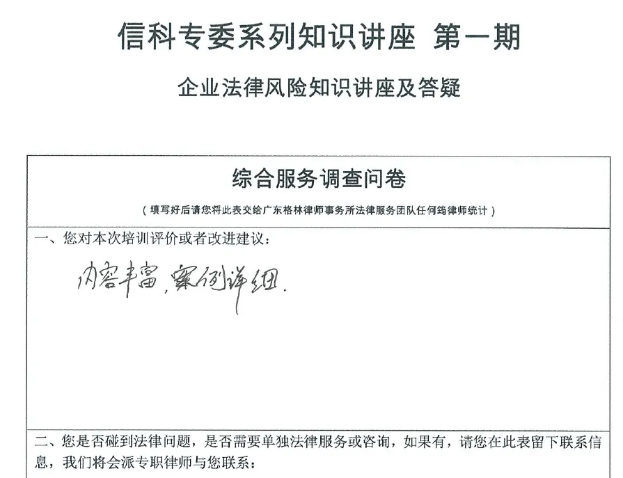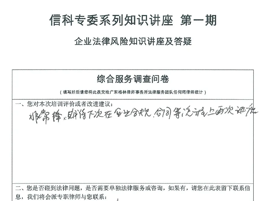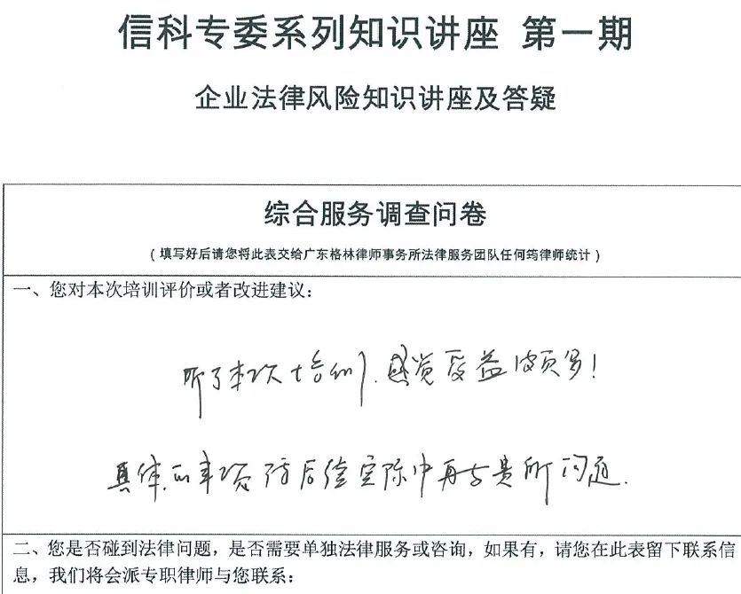 2025年3月20日,广东格林律师事务所夏海珠律师、张泽权律师团队接受广东省湖北商会信息科技专业委员会邀请,在广东格林律师事务所带来了一场主题为《企业法律风险防控实务讲堂》的专题讲座。本次讲座旨在聚焦公司管理、刑事合规、创新保护等企业高频风险场景,通过实战案例解析与现场互动,助力企业筑牢合规防线。