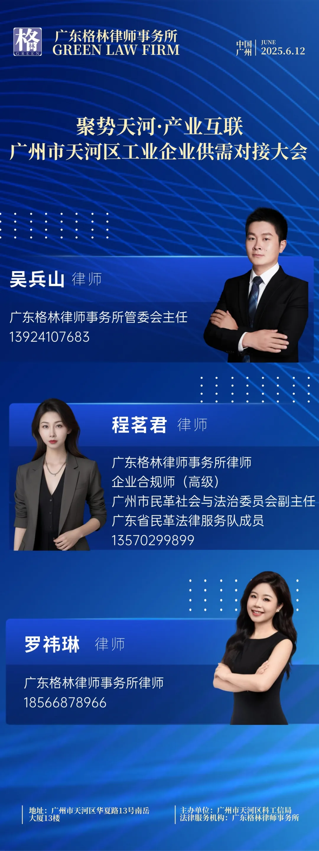 6月12日下午,为深入贯彻国家省市区关于加快现代化产业体系的战略部署,精准聚焦战略性产业领域,天河区科工信局聚焦天河区“12126”现代化产业体系建设,携手区多部门、区行业协会代表,以及区内工业、都市消费业领域重点企业,在广州市(国际)科技成果转化天河基地1F国际会议中心召开了一场盛大的工业企业供需对接大会。广东格林律师律师事务所作为支持单位系本次供需对接大会唯一法律服务机构,我所管委会主任吴兵山律师、程茗君律师、罗祎琳律师及其团队将通过“法律+产业”深度融合,以专业赋能产业发展。为供需大会企业提供合规风控、资源对接、争议预防全链条支持,推动企业合规经营与政策落地,让企业更好地适应政策要求,实现健康发展。