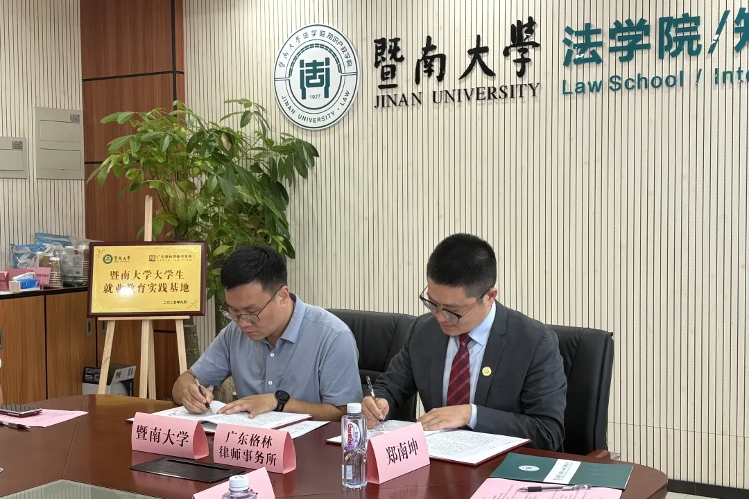 2025年10月10日上午,广东格林律师事务所(以下简称“格林律所”)与暨南大学就业实践基地签约暨挂牌仪式在暨南大学番禺校区知识产权大楼会议室隆重举行。经学校授权,该就业实践基地由法学院/知识产权学院负责具体执行,标志着双方合作正式开启新篇章。
