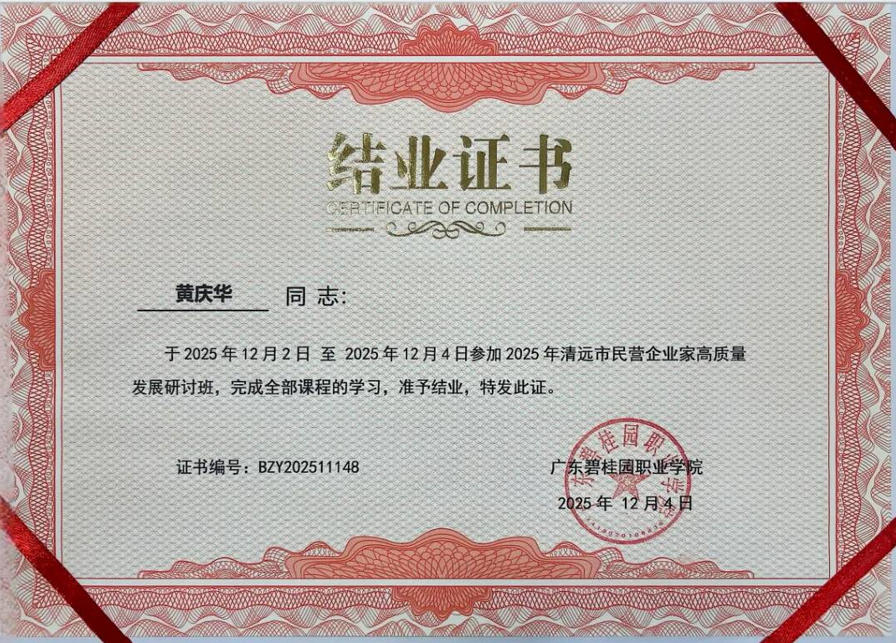 为深入贯彻落实党中央关于支持民营经济发展的决策部署,助力民营企业破解发展难题、增强核心竞争力,2025 年 12 月 2 日至 4 日,由清远市工商业联合会、中国国际贸易促进委员会清远市委员会联合主办,广东碧桂园职业学院承办的 "2025 年清远市民营企业家高质量发展研讨班" 成功举办。我所管委会副主任、党总支副书记、高级合伙人黄庆华律师受邀参加本次研讨班,经过系统学习与深度交流,圆满完成全部培训课程,顺利结业并获颁结业证书。