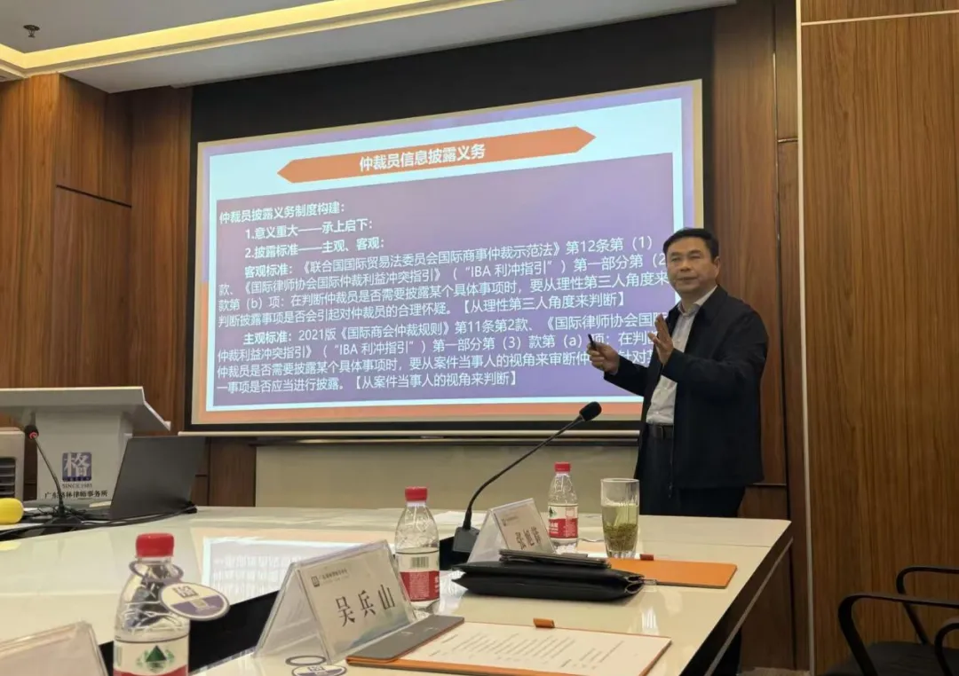 活动最后,市律协涉外专委副主任吴清发对本次交流进行了总结致辞。吴主任充分肯定了两位主讲嘉宾的分享内容,认为其对仲裁法修订要点的解读系统深入,对实务运用的分析具有前瞻性和指导性。他强调,本次修法不仅是法律条文的更新,更是我国仲裁理念与实践的重要发展,期待广州律师能以此为契机,深入研习、积极实践,为推动我国仲裁事业发展贡献专业力量。