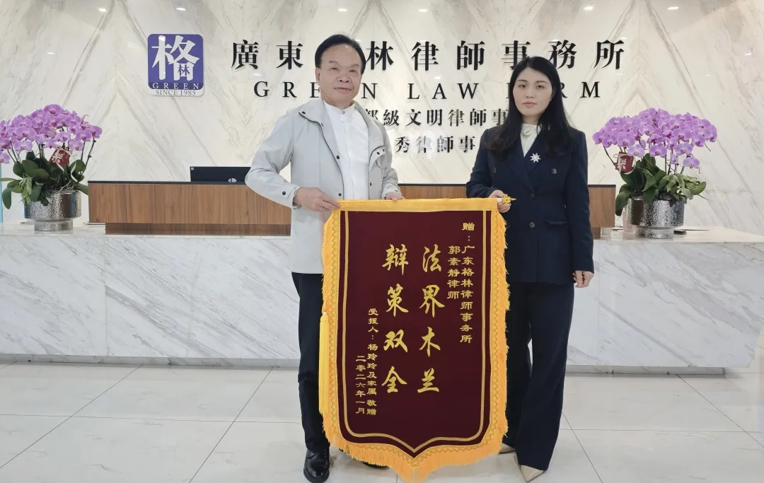 2026年1月5日,在我所管委会副主任黄健律师、党总书记戴辉勇律师以及高级合伙人杨河律师等律师的热情接待下,受援人杨某某的家属廖先生亲手将一面印着“法界木兰,辩策双全”的锦旗交到郭素静律师手中。这面锦旗,既是对郭律师专业能力的高度认可,也是对我所公益法律援助工作的暖心回馈。