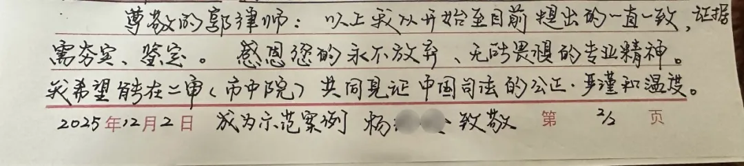 家属廖先生表示“感谢郭律师在案件中的无私奉献与专业坚守,感谢广东格林律师事务所这个平台对郭律师工作的支持,让我妻子的案件在二审中取得比较好的结果。”同时表示“作为台湾商人,我起初对中国大陆的法律体系怀有疑虑,一审判决后更是陷入迷茫。多亏郭律师帮我们走出困境、迎来转机,更让我真切感受到大陆司法的公正与温度,现在对大陆法律越来越有信心了!”
