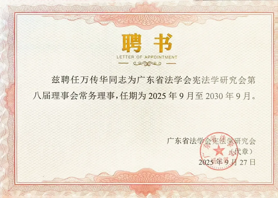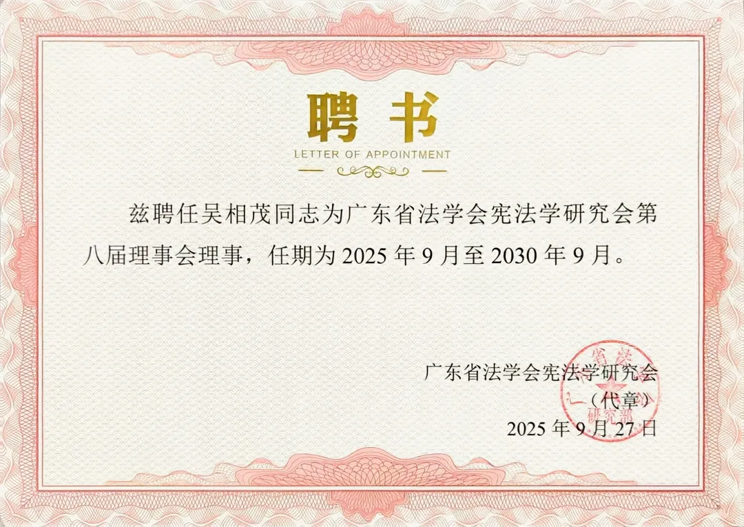 宪法作为国家的根本大法,其研究与实践始终是法学领域的核心议题。此次两位律师能够在众多从业者中脱颖而出,不仅是广东省法学界对他们个人专业素养、学术能力的高度认可,更印证了我所这些年在专业领域深耕不辍、在学术研究上持续投入的成果。一直以来,我所始终重视法律理论与实务的结合,而这份荣誉,正是对我所这份坚持的最佳肯定。