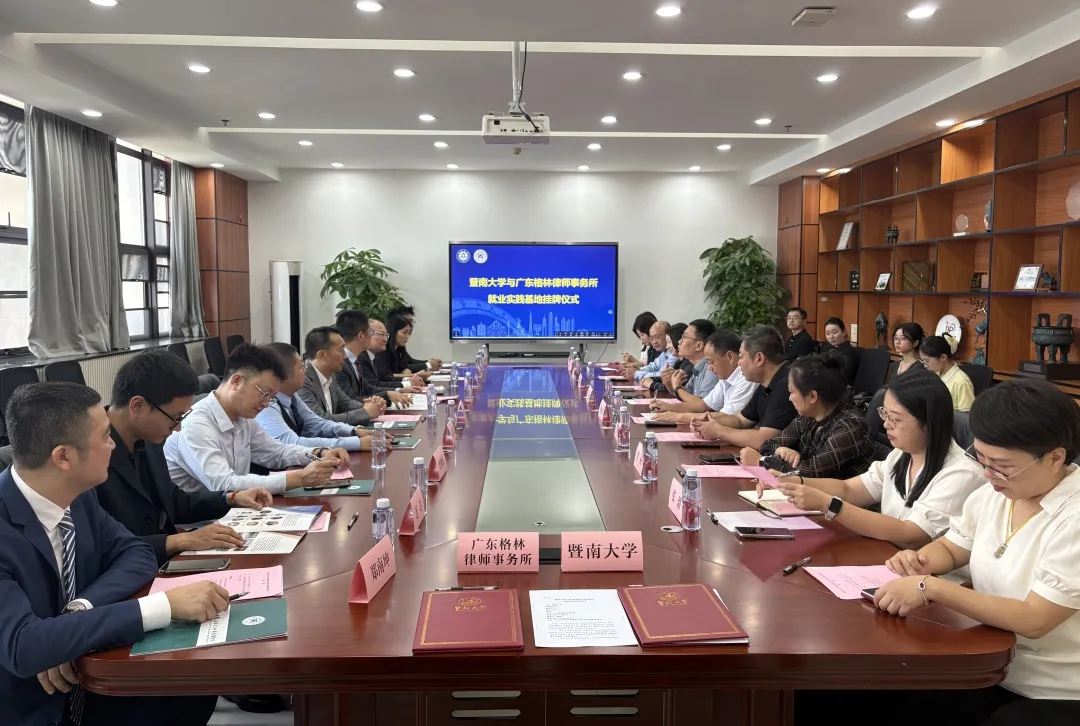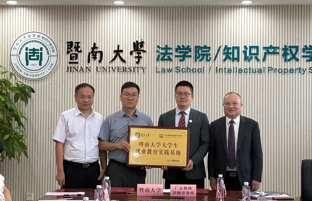 2025年10月10日上午,广东格林律师事务所(以下简称“格林律所”)与暨南大学就业实践基地签约暨挂牌仪式在暨南大学番禺校区知识产权大楼会议室隆重举行。经学校授权,该就业实践基地由法学院/知识产权学院负责具体执行,标志着双方合作正式开启新篇章。