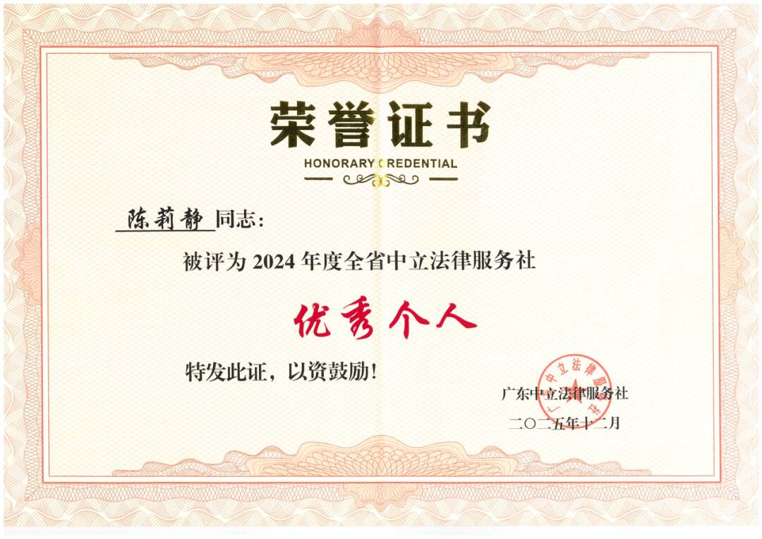 作为广州市中立法律服务社南沙区服务站核心成员,陈莉静主任始终深耕公益法律服务一线,以专业素养化解矛盾纠纷,用责任担当传递法治温度。其经办的《排除妨害纠纷案》创造性采用“法律分析+现场调解”模式,在保障企业正常经营与维护社区和谐之间实现双赢,成功入选广州市中立法律服务社2024年度公益法律服务典型案例。此前,在9月获评“广州市中立法律服务社2024年度优秀法律服务志愿者”,连续斩获市、省级个人荣誉,是对其专业能力与公益精神的双重认可。