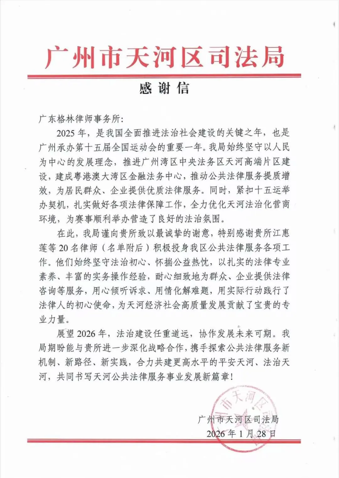 这份感谢信,既是对我所20名律师积极投身天河区公共法律服务、认真履职尽责的高度肯定,也是对我所长年坚守社会责任、深耕公共法律服务领域的充分认可。未来,我所将继续与广州市天河区司法局深化战略合作,持续完善公共法律服务体系建设,积极投身公益法律服务事业,不断探索新机制、新路径、新实践,携手共谱公共法律服务发展新篇章。