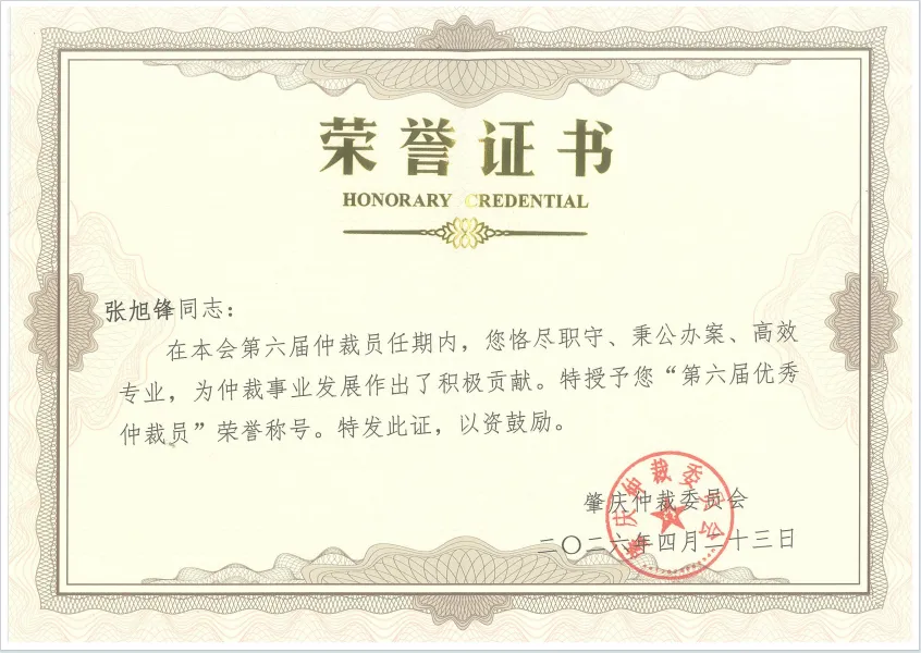 本次“优秀仲裁员”评选工作经仲裁员自主申报、肇庆仲裁委员会服务中心推荐、秘书处综合评议,并报请第六届肇庆仲裁委员会全体会议审议通过及公示,最终确定获奖名单。张旭锋律师自2023年11月受聘为肇庆仲裁委员会仲裁员以来,始终以高度责任心对待每一起案件,展现了卓越的职业素养。